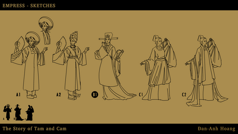 The Story of Tam and Cam is a character design project I worked on during Fall 2020. The character designs are based off of characters in the Vietnamese fairy tale: Chuyện Cổ Tích Tấm Cám (The Story of Tam and Cam). The costuming is based off of pre 20th century traditional Vietnamese clothing. Below is the project pitch and my documented process throughout the weeks I was working on it during my Fall semester at Otis College.